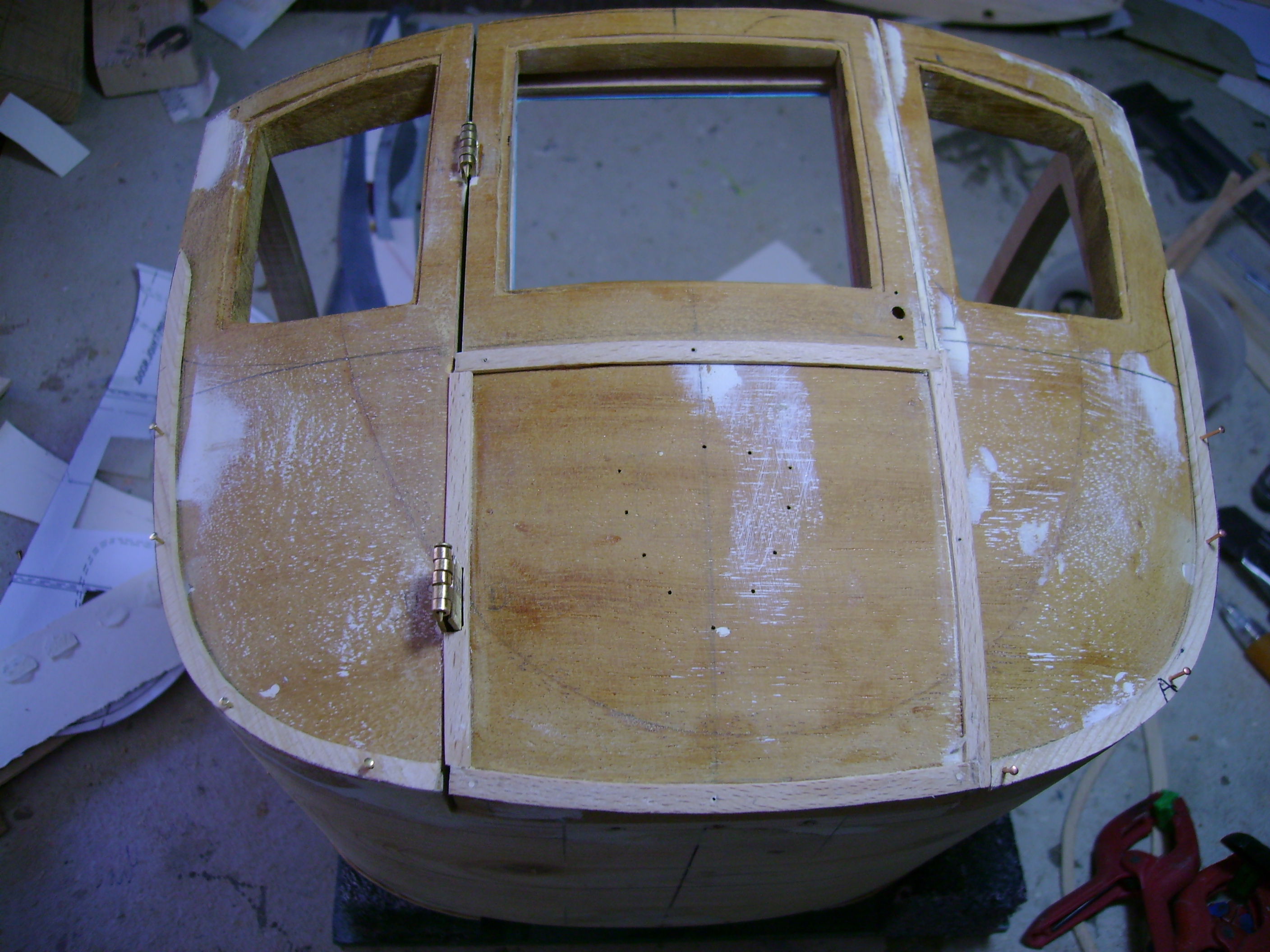 Détail de la construction des poignées de porte, elles sont en métal poli.Construction des frises latérales, avant et arrière, dans le plan d'origine il est suggéré que ces frises soient faites en carton, mais j'ai choisi de les faire en bois de hêtre de 1 mm d'épaisseur, mon expérience me dit que le carton n'est pas idéal pour cela travailler pour plusieurs raisons.